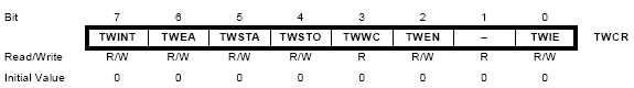 Das TWCR wird verwendet, um die Arbeit des TWI zu kontrollieren. Es wird verwendet, um den TWI freizugeben, um einen Masterzugriff durch Aussenden einer Start-Bedingung zu beginnen, um die Emfangsbestätigung zu erzeugen, um eine Stopp-Bedingung zu erzeugen und um den Takt anzuhalten, während die Daten, die auf den Bus geschrieben werden sollen in das TWDR Register geschrieben werden. Es zeigt ebenfalls eine Schreibkollision wenn versucht wird, Daten in das TWDR zu schreiben, während dieses Register nicht ansprechbar ist.