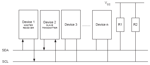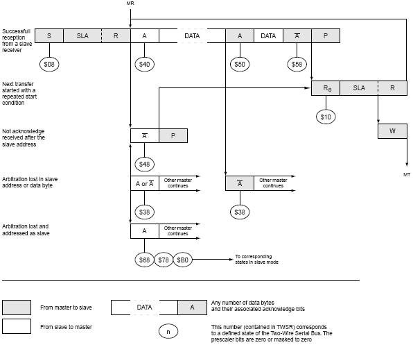 Im Master Empfänger Modus wird eine Anzahl von Bytes von einem Slave Sender empfangen. Um in den Master Empfänger Modus zu gelangen, wird eine START Bedingung ausgesendet. Das Format des darauf folgenden Adresspaketes bestimmt, ob der Master Sende oder Master Empfangs Modus ausgewählt wird. Wenn ein SLA+W Adresspaket ausgegeben wird, wird der Master Sende Modus ausgewählt, wenn ein SLA+R Adresspaket ausgegeben wird, erfolgt der Eintritt in den Master Empfangs Modus. Alle Statuscodes, die nachfolgend angegeben sind, unterstellen, dass die Vorteilerbits mit 0 maskiert sind.