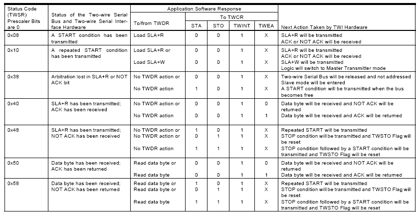 Wenn das SLA+R Adresspaket gesendet und eine Bestätigung (ACK) empfangen wurde, so wird das TWINT Flag wieder gesetzt und der Stauscode im TWSR aktualisiert. Mögliche Statuscodes in diesem Master Modus sind 38h, 40h oder 48h. Wie bei den unterschiedlichen Statuscodes weiter verfahren wird, ist in der Tabelle angegeben.