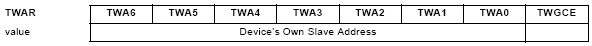 Die oberen 7 Bits bilden die Adresse, über die das TWI durch einen anderen Master angesprochen werden kann. Wenn das TWGCE Bit gesetzt ist, wird der Baustein auch durch einen Rundruf angesprochen, andernfalls ignoriert er Rundrufe.