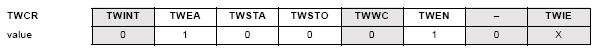 TWEN muss auf 1 gesetzt werden, um das TWI freizugeben. Das TWEA Bit muss auf eins gesetzt werden, um das Bestätigen der eigenen Salve-Adresse oder eines Rundrufes freizugeben. TWSTA und TWSTO müssen auf 0 gesetzt werden.