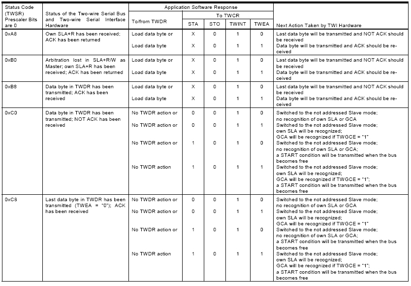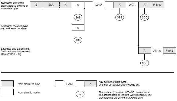Wenn TWAR und TWCR initialisiert sind, wartet das TWI bis es durch die eigene Salve Adresse (oder einen Rundruf, wenn freigegeben) gefolgt von dem Datenrichtigs Bit adressiert wurde. Wenn das Richtungsbit 1 ist (Read), arbeitet das TWI im Slave Sender Modus, andernfalls wird der Slave Empfänger Modus eingeschaltet. Nachdem die eigene Slave Adresse und das Read Bit empfangen wurden, wird das TWINT Flag gesetzt und ein gültiger Statuscode kann aus dem TWSR gelesen werden. Der Statuscode wird verwendet, um die folgende Aktion der Software zu bestimmen. Die möglichen Aktionen der Software sind für die unterschiedlichen Statuscodes in der nachfolgenden Tabelle beschrieben. Der Slave Sender Modus kann auch eingeschaltet werden, wenn der Baustein das Schiedsgericht im Mastermodus verloren hat (siehe Status B0h).
