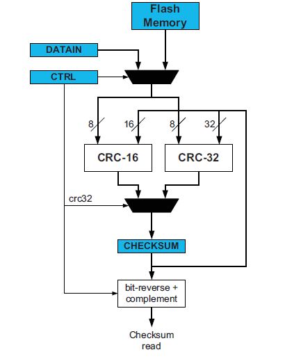 Wenn CRC für eine I/O Schnittstelle verwendet wird kann zwischen CRC-16 und CRC-32 gewählt werden (default CRC-16). Wenn der Flash die Quelle ist, wird automatisch CRC-32 verwendet. Das CRC Modul arbeiten byteweise.