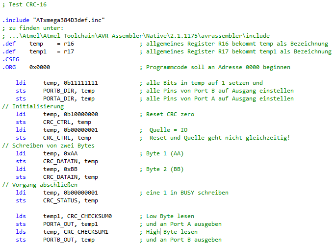 Ein CRC Kalkulation kann mit allen Daten durchgeführt werden, die in das DATAIN Register des CRC Moduls geschrieben werden. Mit dieser Methode kann eine beliebige Anzahl Bytes in das Register geschrieben werden und die Prüfsumme wird fortlaufen ermittelt. Am Ende wird das BUSY Flag im STATUS Register durch Schreiben einer 1 gelöscht. Damit ist der Vorgang abgeschlossen und die Prüfsumme steht im CHECKSUM Register.