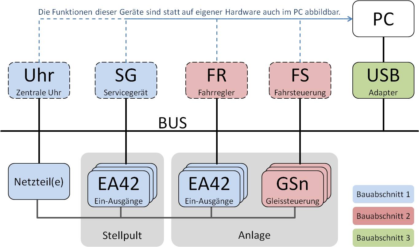 Mit den Geräten des ersten Bauabschnitts wird alles gesteuert, was nicht auf dem Gleis steht. Basis ist ein universelles Modul (EA42), das 42 Anschlüsse besitzt die wahlweise als Eingang (Schalter, Tasten, usw.) oder als Ausgang (Licht, Weichen, Signale usw.) genutzt werden können. Alle Module werden über einen BUS miteinander verbunden. Theoretisch können über 8.000 Module an den BUS angeschlossen werden.