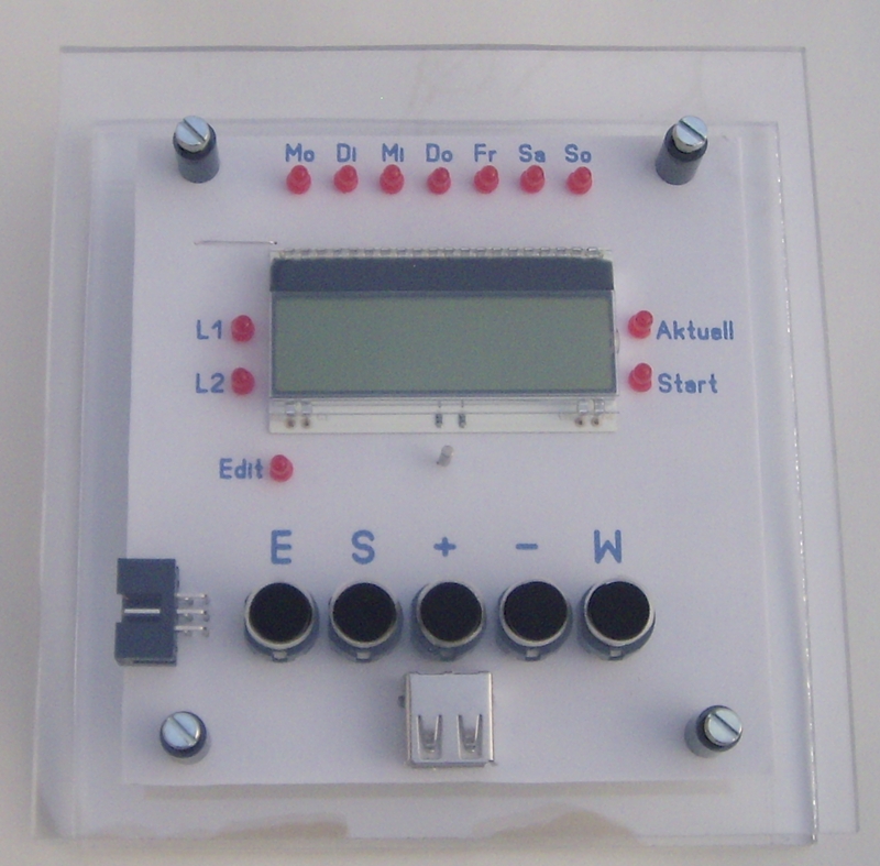 Dieses Modul zeigt auf einer 8-stelligen Anzeige die aktuelle Systemzeit an (Std:Min:Sek). Der aktuelle Tag wird durch eine entsprechende LED signalisiert. Die Startzeit, also die Zeit, mit der die Uhr nach dem Einschalten der Betriebsspannung beginnt, und der Zeitrafferwert können ebenfalls angezeigt werden.